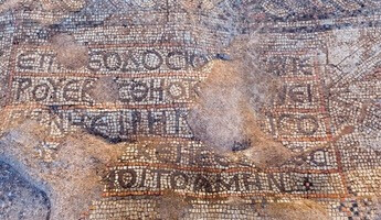 Greek writings about a priest named Theodeus (a common name in the period). "This place was built under the Priest Theodeus. Welcome to those who come, and good tidings to those who leave, Amen," the mosaic reads.