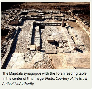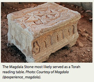 when archaeologists of the IAA—ahead of the development of the local tourist center—discovered a synagogue. One of perhaps only eight synagogues identified so far in Israel as dating from the first century C.E., it provided one splendid find—the so-called Magdala Stone, a Torah reading table sculpted in stone with reliefs depicting a seven-branched menorah and possibly the Jerusalem Temple.
