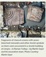 In the midst of these pagan and Christian influences, it appears that there was also a Jewish presence at Limyra, Turkey. In a building recently excavated by Martin Seyer, chancel screens with Jewish symbols—menorahs, a shofar and a lulav (palm branch)—have been uncovered. In a later period, these screens were broken and reused as paving stones.