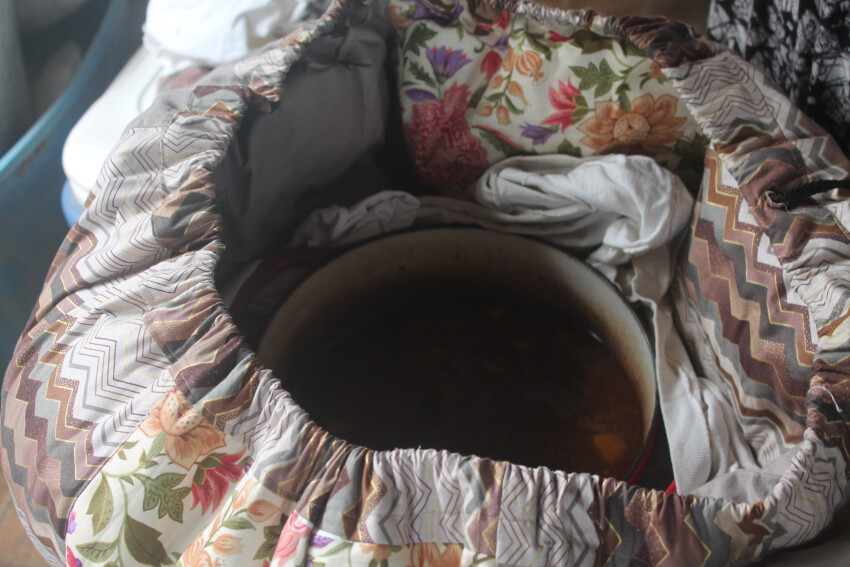 We are always praying about ways to help others. A recent idea came from a dear friend who visited the farm. Our day-to-day activities reflect that of the local people. Most of what we eat comes from the farm, our water comes from the stream, and while we do have gas to cook with we also do a lot of cooking on the fire. We are always looking for ways to save money; using what we have and teaching others to do the same. The Wonderoven has been a blessed addition to our kitchen as well as others. The idea comes from cooking in a hole under the ground or in a haybox. Its shape is similar to a bean bag. Since we do our best to recycle and reuse what we have, ours are made with cotton fabric, well-used cotton sheets, and denim material. It is insulated with blankets and broken pieces of old foam.