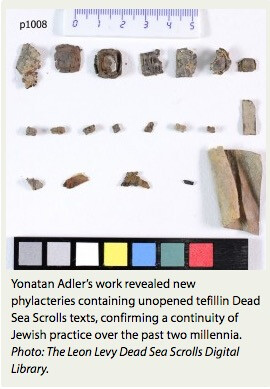 After discovering a new Dead Sea Scroll text by conducting a CT scan on a phylactery from Qumran, Ariel University scholar Yonatan Adler began to look for additional tefillin texts. According to a Times of Israel article, Adler’s quest took him to the Dead Sea Scroll lab at the Israel Museum, where he discovered additional rolled up tefillin texts inside fragments of phylactery cases.