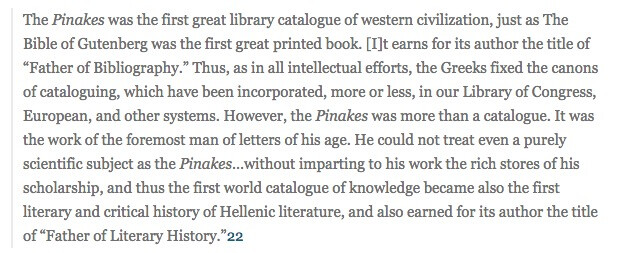 The Pinakes identified each volume by its title, then recorded the name and birthplace of the author, the name of the author’s father and teachers, the place and nature of the author’s education, any nickname or pseudonym applied to the author, a short biography (including a list of the author’s works and a comment on their authenticity), the first line of the work specified, a brief digest of the volume, the source from which the book was acquired (such as the city where it was bought or the ship or traveler from which it was confiscated), the name of the former owner, the name of the scholar who edited or corrected the text, whether the book contained a single work or numerous distinct works, and the total number of lines in each work.21