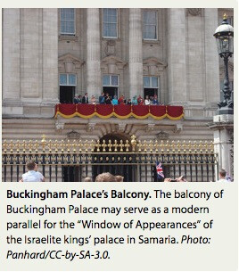 recounted in 2 Kings 9:30–37. When Jezebel (who, at this point, is the widow of King Ahab) hears that Jehu, who had usurped the throne, is approaching the palace, she “painted her eyes, and adorned her head, and looked out of the window” (2 Kings 9:30). At Jehu’s command, Jezebel is thrown from this “window” and killed. Now we can better envision this scene as taking place at a “Window of Appearances.”